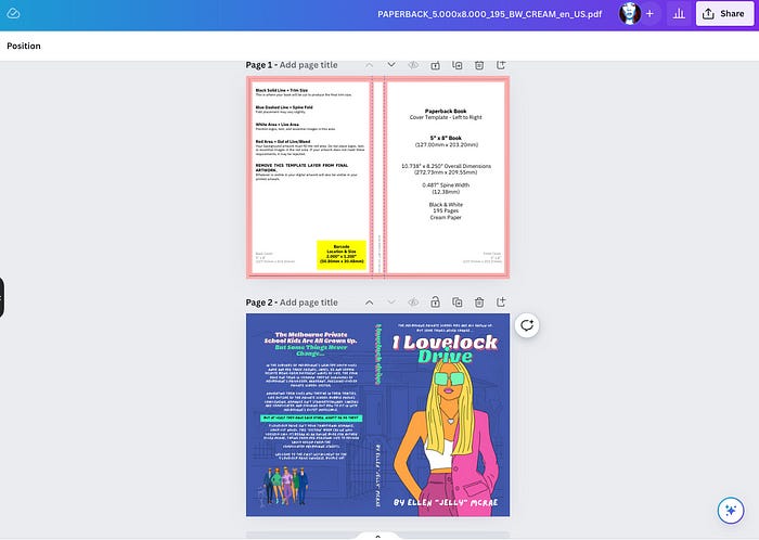 Here is an example I’ve plugged in to show you how to cover the template turns out. I downloaded the template, uploaded this file to Canva and used the dimensions to create my book.