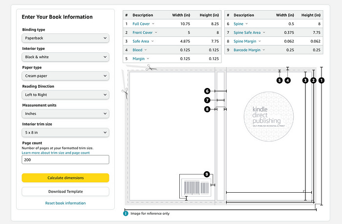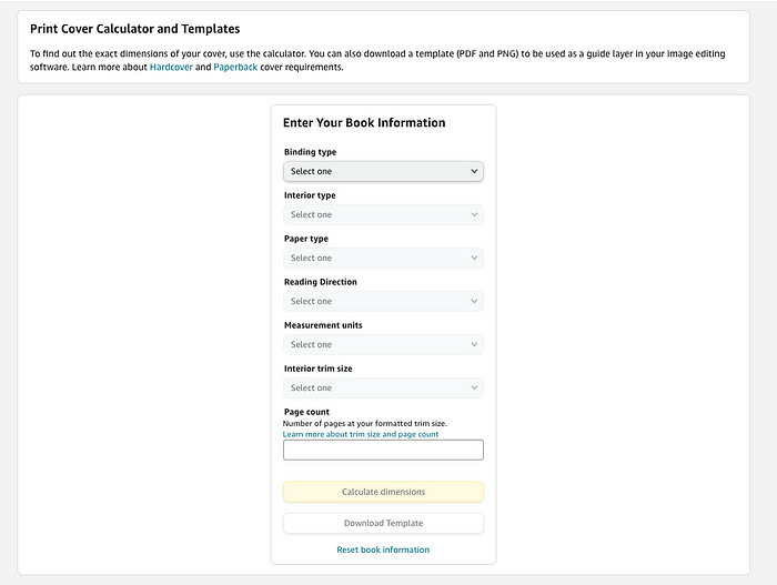 They call it the KDP cover calculator, as shown above. As you can see below, all you need to do is select the appropriate details from the drop-down options, and a cover template will be created for you.